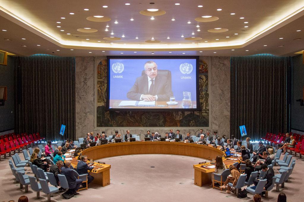 Zahir Tanin (shown on screen), Special Representative of the Secretary-General and Head of the United Nations Interim Administration Mission in Kosovo (UNMIK), briefs the Security Council via video tele conference. UN Photo/JC McIlwaine
