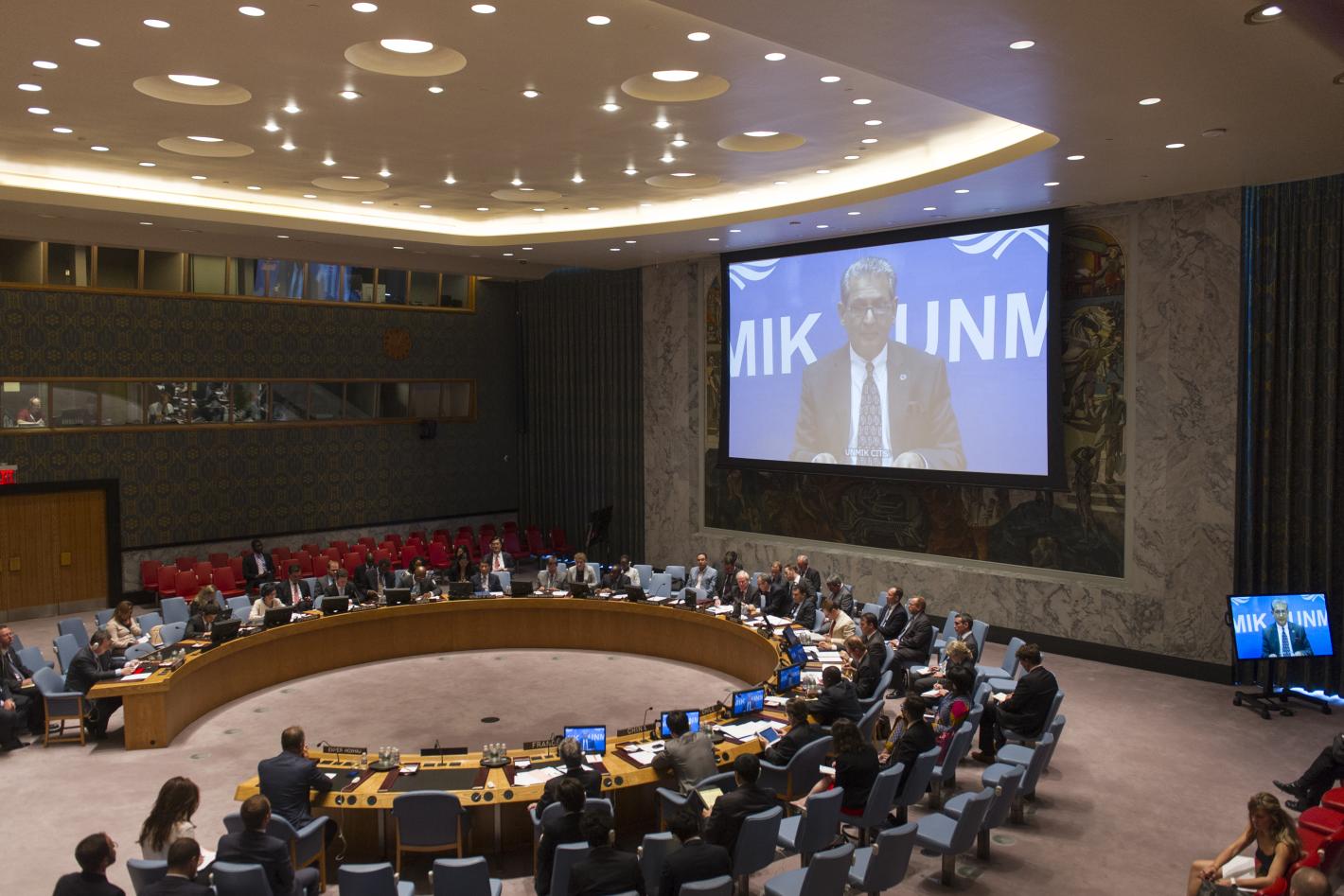 Kosovo: citing recent unrest, UN envoy urges close vigilance to safeguard achievements A view of the Security Council Chamber as Farid Zarif (shown on screen), Special Representative of the Secretary-General and Head of the…