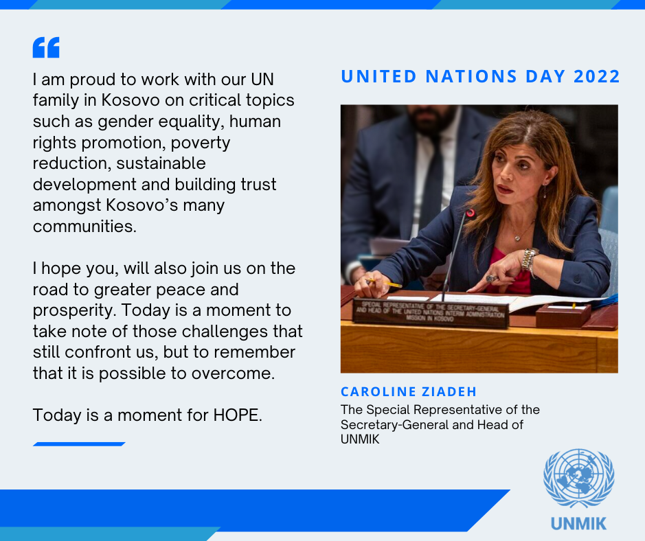 The Special Representative of the Secretary-General and Head of UNMIK Caroline Ziadeh echoes the words of the UN Secretary-General who, in his UN Day message, reminds us that peace must bring a stop to conflicts that ‘jeopardize lives, futures and global progress’.