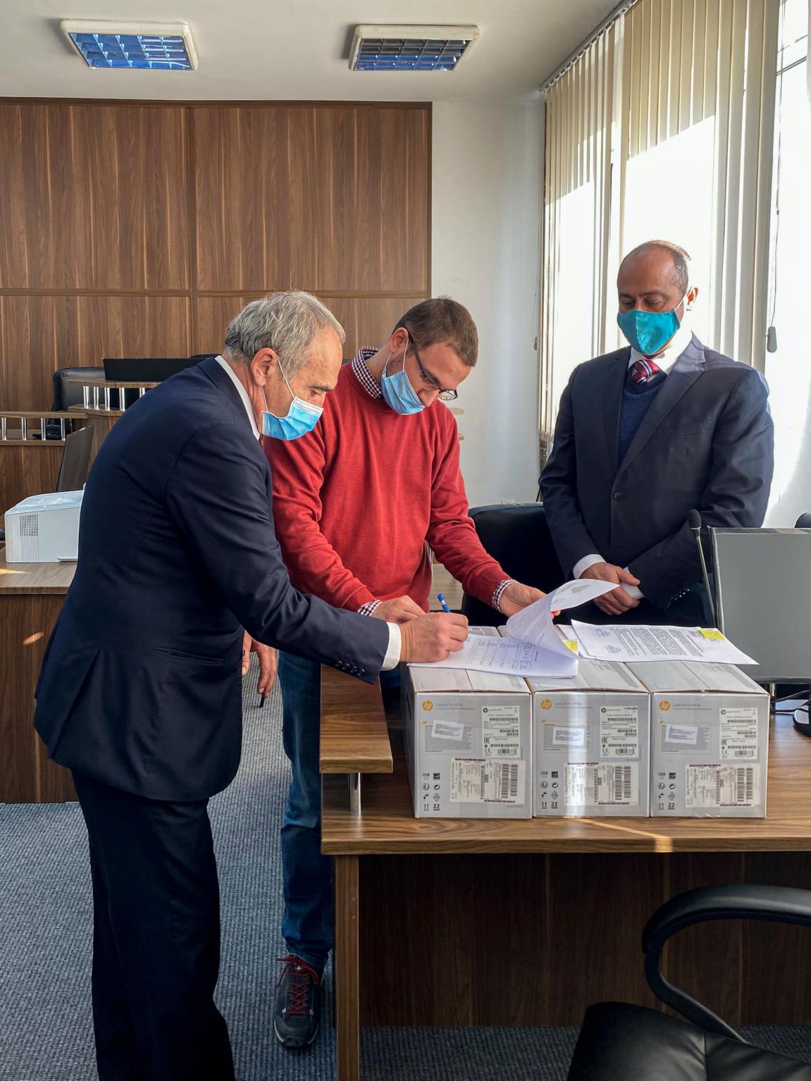 UNMIK’s implementing partner, the Advocacy Center for Democratic Culture (ACDC) delivered the equipment to the Chief Judge at the Appellate Court Division in North Mitrovica, Mr. Milan Bigović, in the presence of the Head of the UNMIK Rule of Law Office, Mr. Antero Lopes.