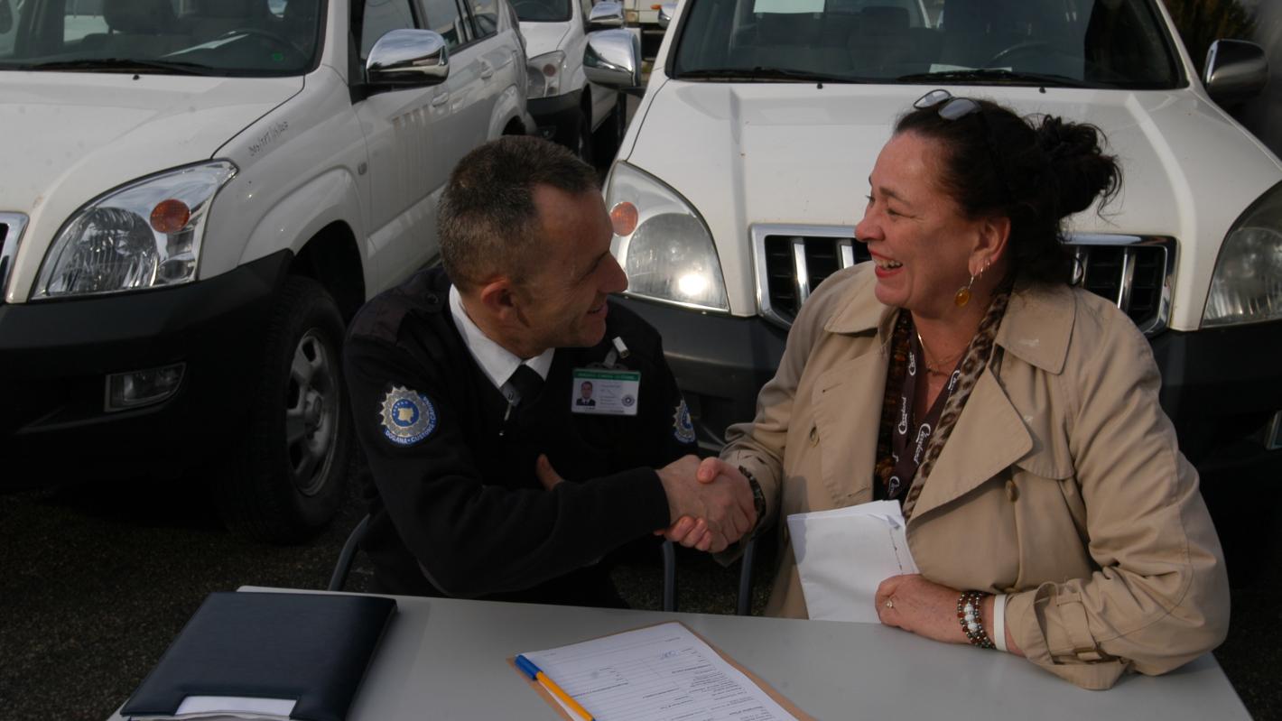 DSRSG Jennifer Brush (right) donates UNMIK vehicle to representative of Kosovo Customs