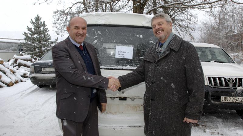 On 11 December In Kamenicë/Kamenica, UNMIK Deputy SRSG Robert Sorenson presented a vehicle and other items to Mayor Shaip Surdulli during a special handover ceremony. "We are all aware of the challenges particularly these days of economic hardship. So, in this regard, I am pleased we are able to offer some assistance," said DSRSG Sorenson.